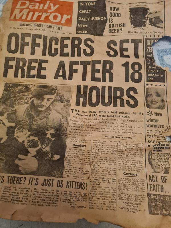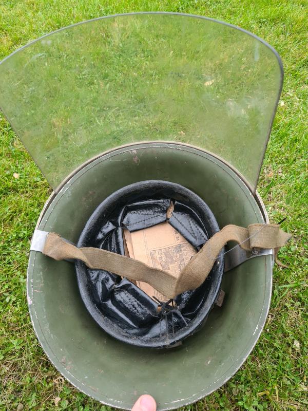 Very nice early type Riot helmet as used right from the start of the Troubles 1969 - the mid 1980s .This has an original newspaper from 1972 inside the liner probably for insulation with a story of two officers captured by the IRA but released. The face shield was made in Northern Ireland in a hurry and was fixed to the first helmets and not removable, so handed over from one unit to the next for twenty years .