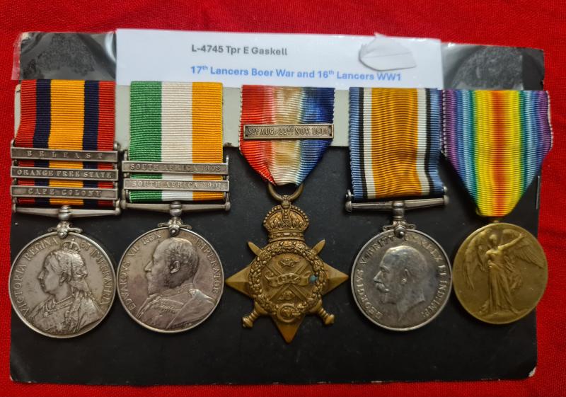Excellent group to Tpr E Gaskell of the 17th Lancers in the Boer War and 16th Lancers in WW1, the Lancers were some of the first casualties of The Dublin Rising when the charged down Sack ville Street (O Connell Street ) and were shot down from the GPO.
